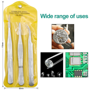 This set of three stainless steel tweezers is an essential toolkit for anyone working with electronics, jewelry, model-making, or other intricate tasks requiring precision handling. Crafted from high-quality, anti-static stainless steel, these tweezers are designed to be durable, resistant to rust and corrosion, and safe for handling static-sensitive components like integrated circuits (ICs) and transistors. The set typically includes a variety of tip styles to cover a wide range of applications: a fine-point tweezer for picking up the smallest surface-mount device (SMD) components, a curved tip for accessing components in tight spaces or at awkward angles, and a flat or straight tip for general-purpose gripping and bending.
