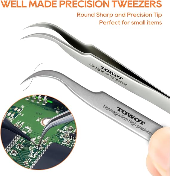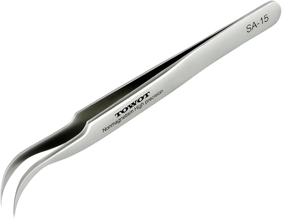 Great quality tweezers! They make working on small components easy. The bent tip helps reach tight spots without straining my hands.