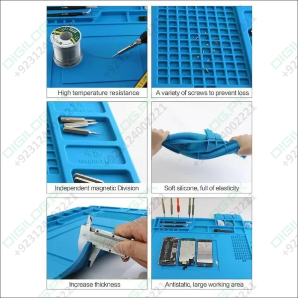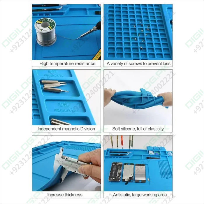 The Large Heat Insulation Silicone Soldering and Repairing Mat is an essential accessory for electronics workbenches, providing a durable and heat-resistant surface for soldering, desoldering, and component repair. Made from high-quality food-grade silicone, it can endure direct contact with hot soldering irons (up to 500°C) without melting, burning, or emitting harmful fumes. The mat’s non-stick surface prevents adhesives, flux, or solder from adhering, making cleanup effortless with a simple wipe. Its flexibility allows it to lie flat on any surface, and it often includes features like component compartments, ruler markings, and adhesive-resistant zones to organize small parts during intricate projects. This mat not only protects tables from heat damage and scratches but also enhances safety by insulating against accidental electrical shorts. Whether for professional repair shops or hobbyist use, it ensures a clean, organized, and safe workspace.